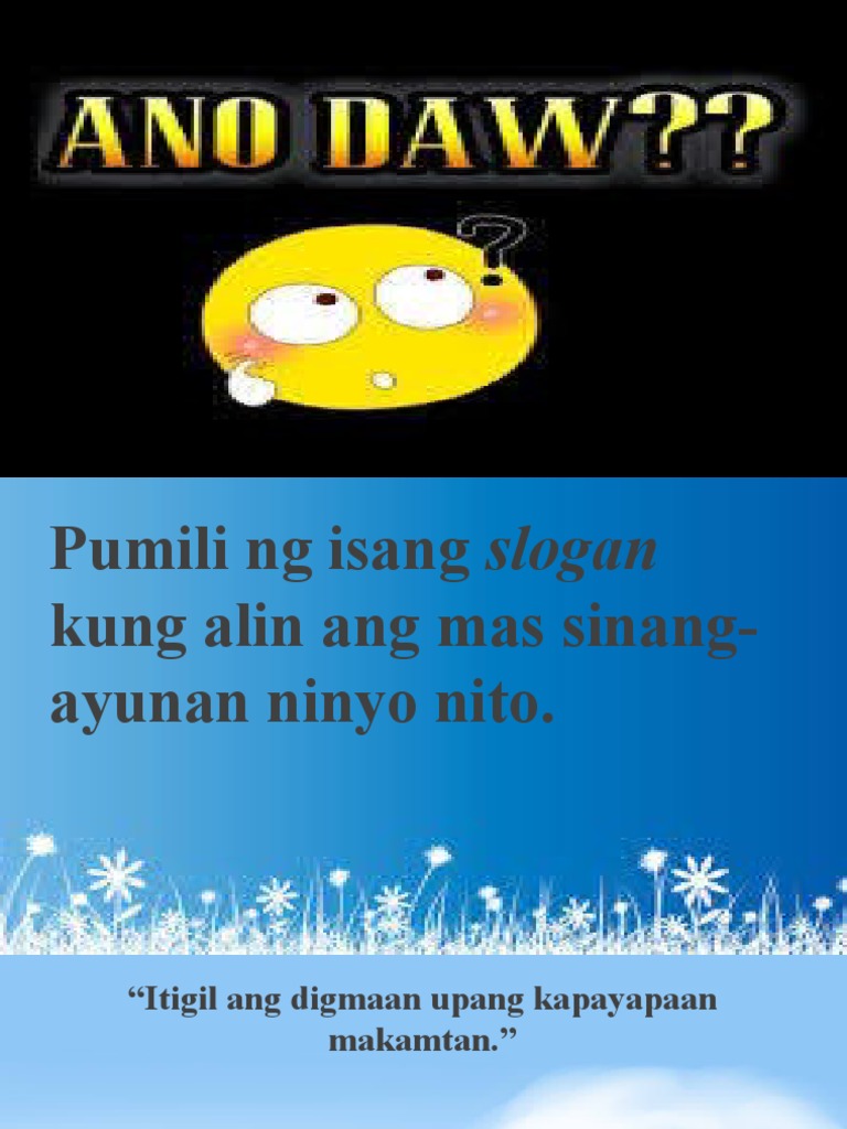 Gumawa tayo ng slogan. SLOGAN MAKING Nakapagmumungkahi ng mga paraan ng paglutas sa mga paglabag ng karapatang pantao GROUP 3 Andoyo Baltazar Estillore Morgia Oville Quibol Solis Taneo Tano Gawin ito sa Martes at ipresenta sa Miyerkules. -Agham at teknolohiya -kalakalan -medisina -sining -pagkilos.