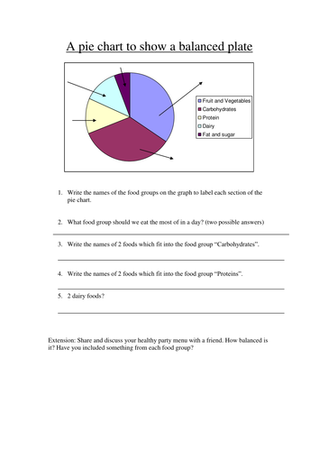 A worksheet to check children what a balanced diet should consist of and what the different food groups are. This balanced diet worksheet for KS2 is a perfect quick activity to reinforce the importance of understanding that different foods have different effects on your bodyOn download youll find that this worksheet features a balanced diet pie chart that represents a plate that has been divided into different food groups includingFruits and. To visualize the percentage for the parts of one total and in many other fields.